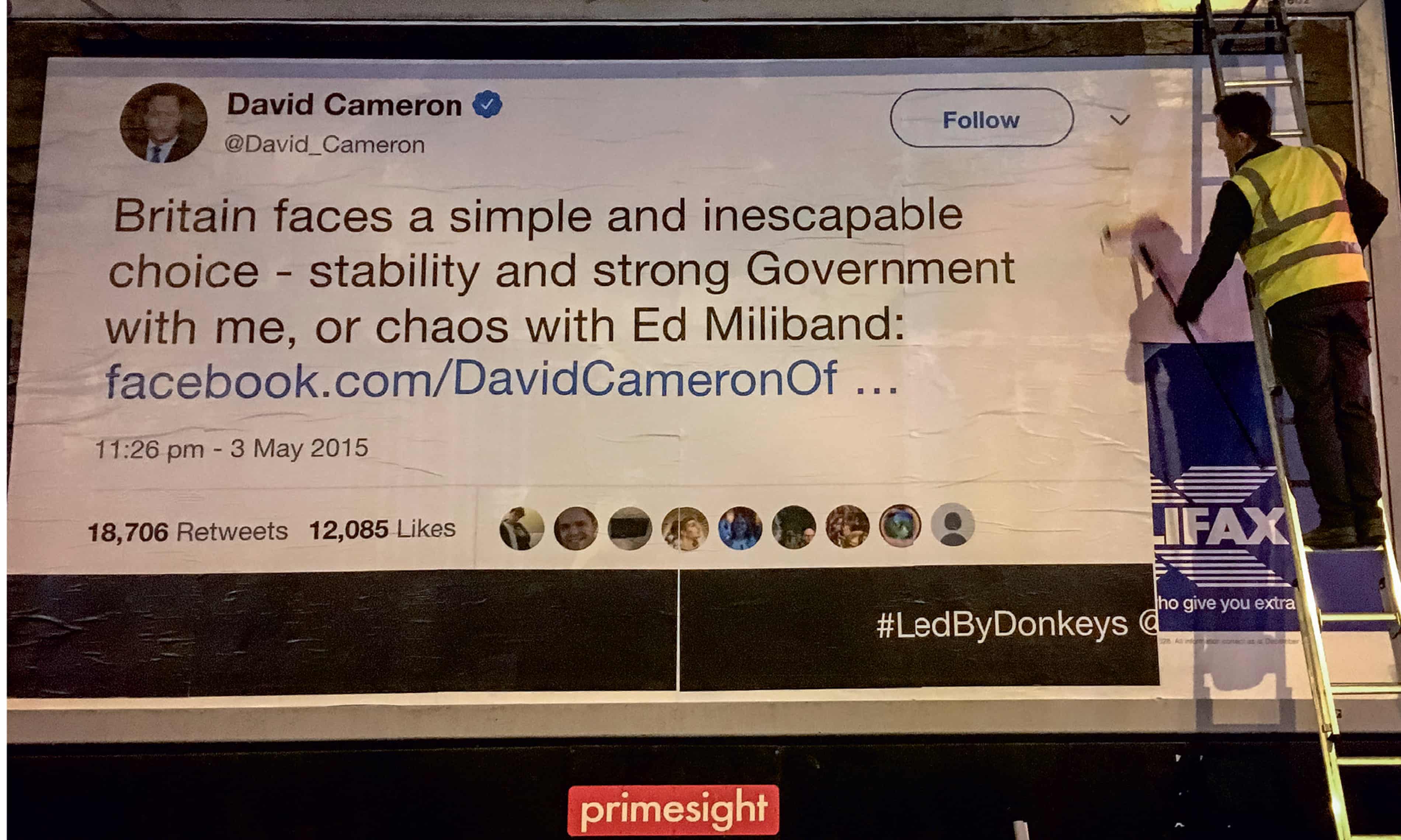 Led By Donkeys, eski Başbakan David Cameron’ın 2015’te attığı bir tweet’i billboard’a yapıştırdığı bir eylem ile hayatına başladı. Bu küçük açık hava eylemini, Twitter hesapları ile dijitale taşıdılar ve bu billboard o kadar viral oldu ki, adeta durduğu yerden tüm ülkeyi dolaştı.
